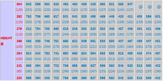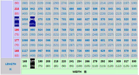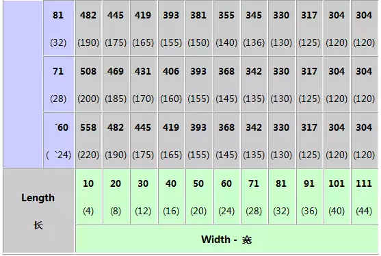 左側(cè)紅色字體藕荷色背景數(shù)據(jù)代表貨物高度,右側(cè)藍(lán)色字體灰色背景數(shù)據(jù)代表貨物長度,底部黑色字體綠色背景數(shù)據(jù)代表貨物寬度,每個(gè)格的上部數(shù)字為厘米(cm),下部數(shù)據(jù)為對(duì)應(yīng)折算的英寸(Inch);