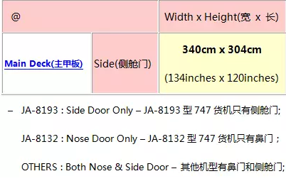 b. 針對(duì)前艙門和后艙門,雖然艙門高度為168cm, 但因?yàn)榧b器(板)本身有高度,并裝貨時(shí)需要考慮貨物頂部要和艙門上邊框保持合理安全距離,一般要求裝貨的高度低于160CM; 因?yàn)锽OE747機(jī)體較寬,可以允許貨物裝入飛機(jī)的寬度可以超微超過空運(yùn)集裝板的244CM寬度,但需要進(jìn)行墊板操作;