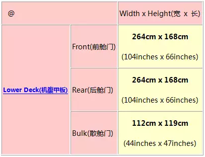 值得注意的是,機(jī)頭開口的實(shí)際尺寸為264cm(寬)x 248cm(高),但考慮到實(shí)際推入貨物到飛機(jī)機(jī)艙時(shí)航空公司都要求貨物兩側(cè)和頂部要和機(jī)艙門框保持合理距離,避免貨物剮蹭機(jī)頭造成安全隱患,并主要類型航空運(yùn)輸集裝器的寬度為244cm,所以從鼻(機(jī)頭)門進(jìn)入飛機(jī)的貨物尺寸高度和寬度被限定為244cm;